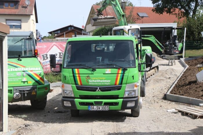 Heute sind sechs FUSO Canter mit Dreiseitenkippaufbau im knalligen Grasgrün der Schellheimer GmbH unterwegs. Nicht zuletzt wegen des über die Jahre immer umfangreicheren Tätigkeitsportfolios, das der Landschafts- und Gartenbau-Spezialist und sein Team anbieten, setzt Lars Schellheimer bei seinen aktuellen Fahrzeugen vor allem auf die hohe Nutzlast des robusten 7,5t-Canters. Sie ermöglicht das Ziehen schwerer Anhänger: „Wenn wir morgens auf der ersten Fahrt zur Baustelle bereits Schüttgut aus unserem Lager aufladen können, sparen wir Zeit und Geld. Dasselbe gilt für den letzten Aushub des Tages.“